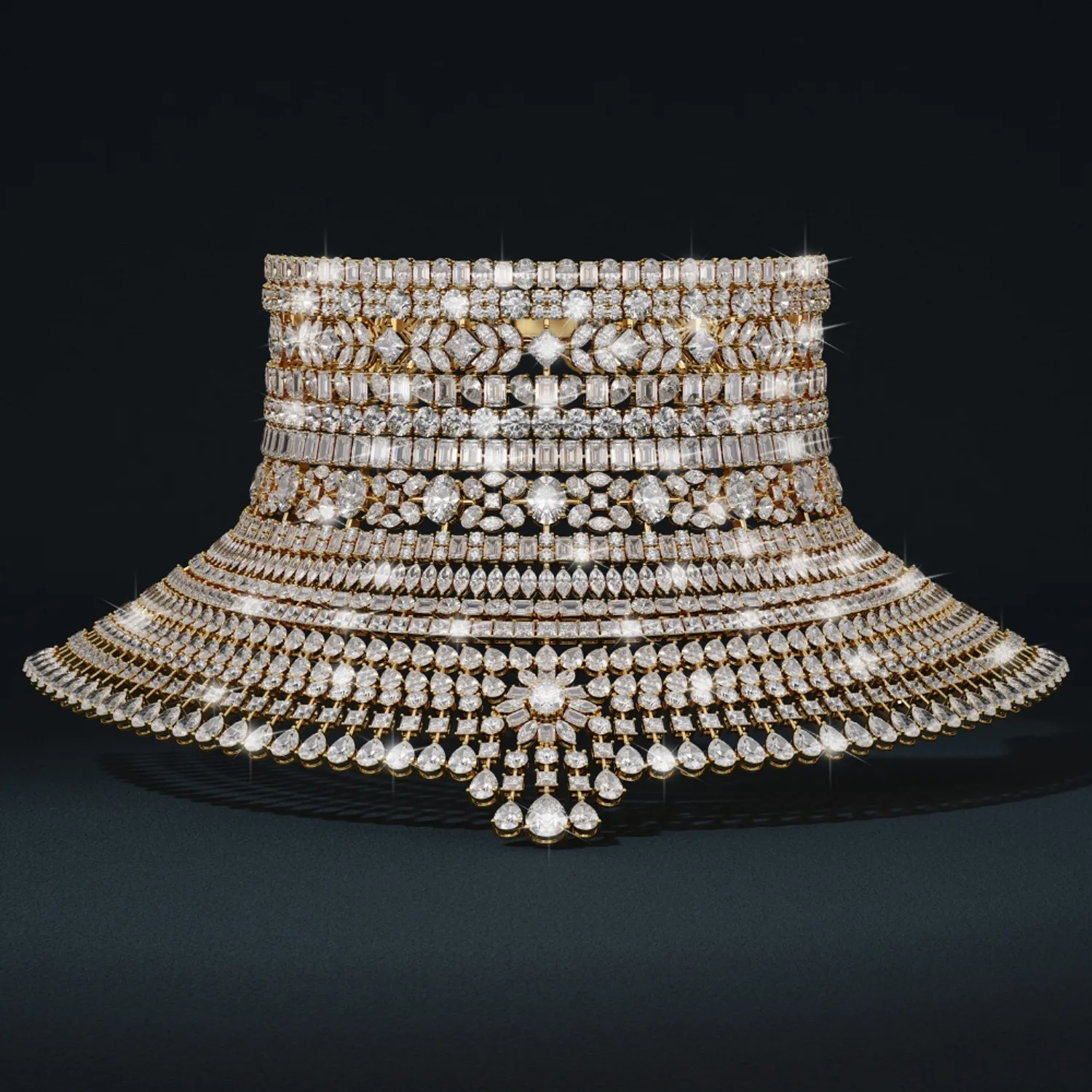 View DetailsAn ode to power without weight, movement without excess, and light as lineage. Born of symmetry and spirit, the Empress of Light is Kojo’s sovereign creation, a monument to mastery and grace. Hundreds of diamonds curve into a celestial crescent, their brilliance drawn toward two rare emerald hearts, the pulse of an empire reborn in radiance. In her presence, silence becomes ceremony. Composed over 1,200 hours of handwork, the Empress of Light is sculpted in 18K mirror-polished white gold and finished with over 600 individually set stones. Its form flows in multi-tier pavé and invisible settings, engineered for perfect articulation and comfort. The twin oval emeralds, weighing nearly 50 carats, anchor the necklace like a constellation’s heart, encircled by over 420 carats of fine white diamonds. Every facet is aligned to catch light as movement, transforming still brilliance into living fire.