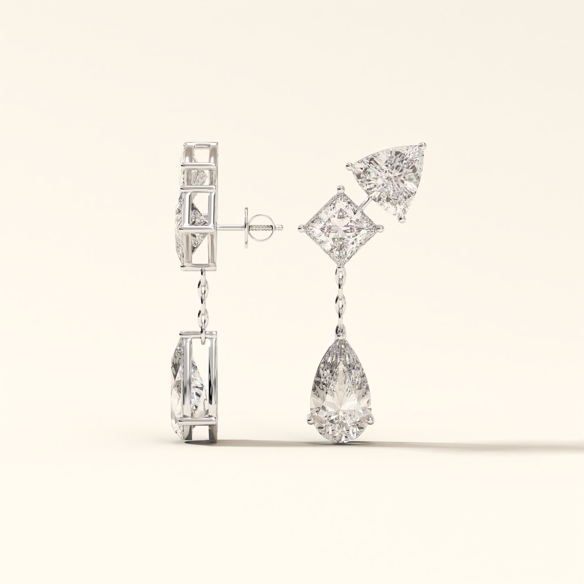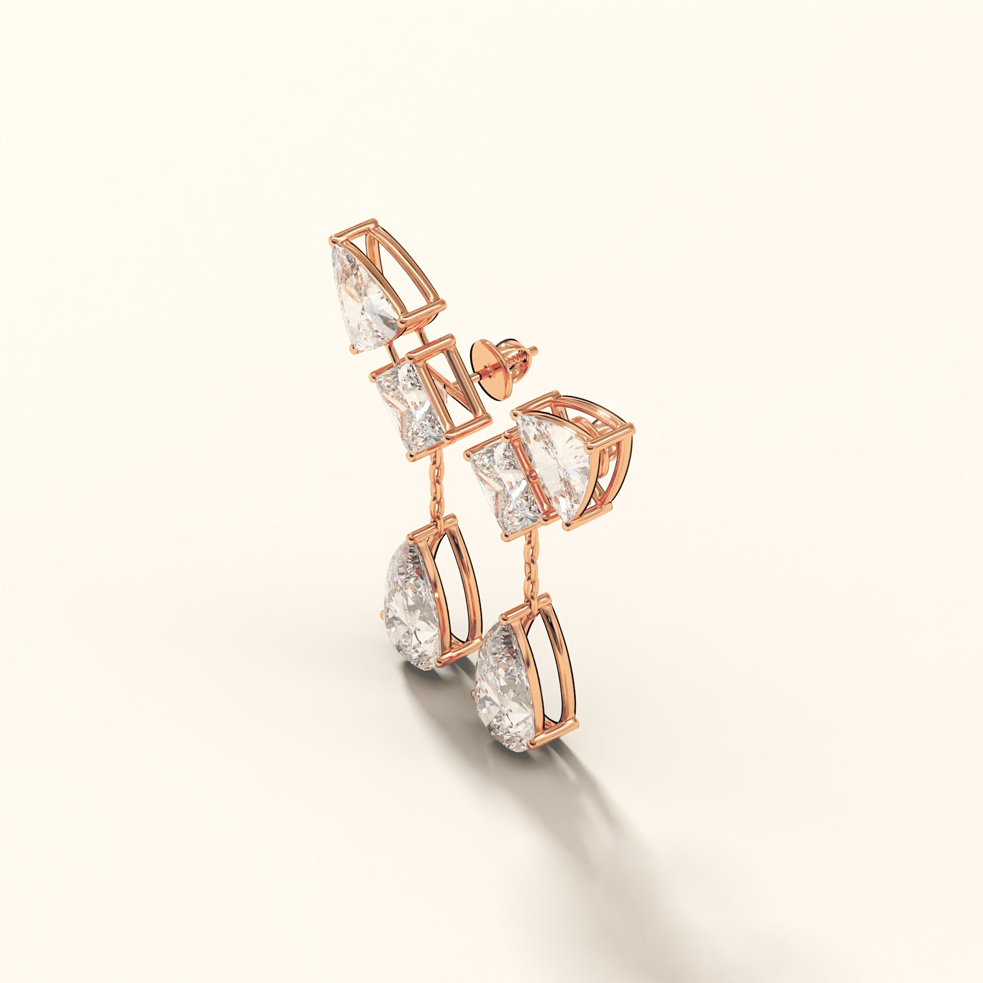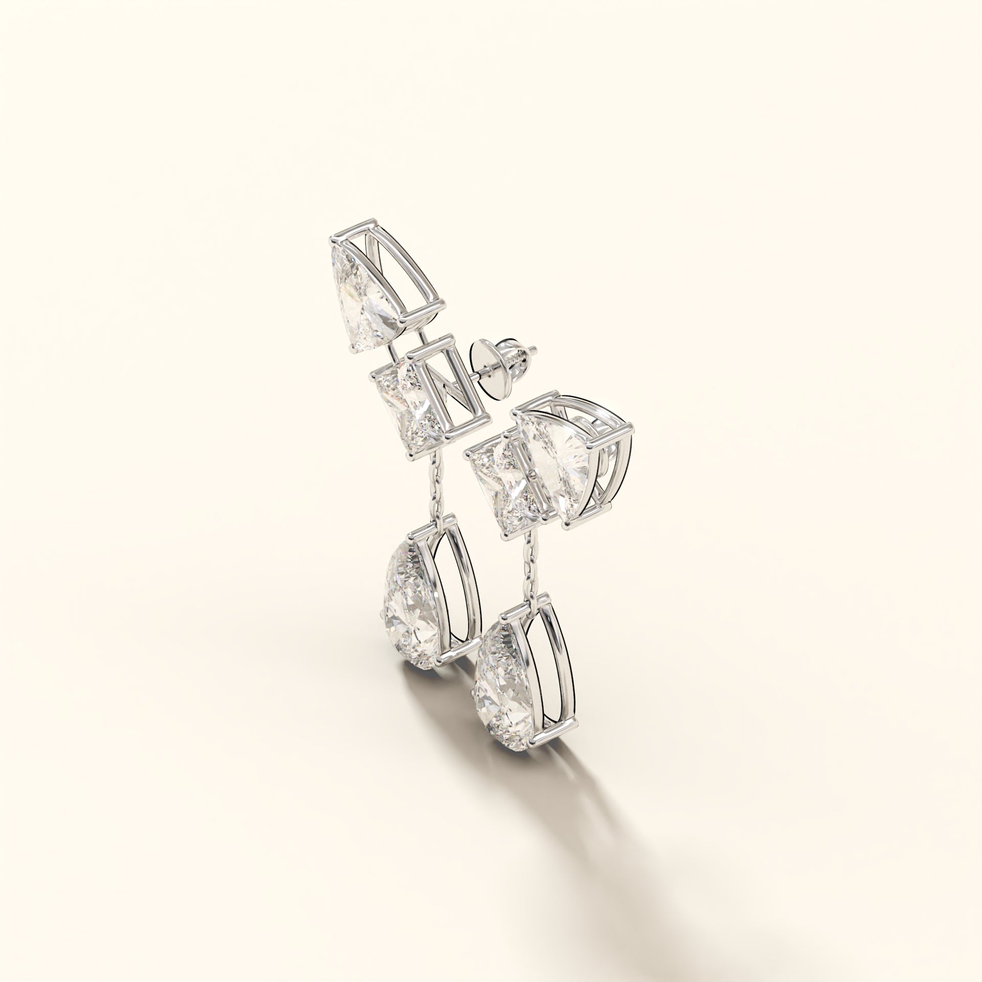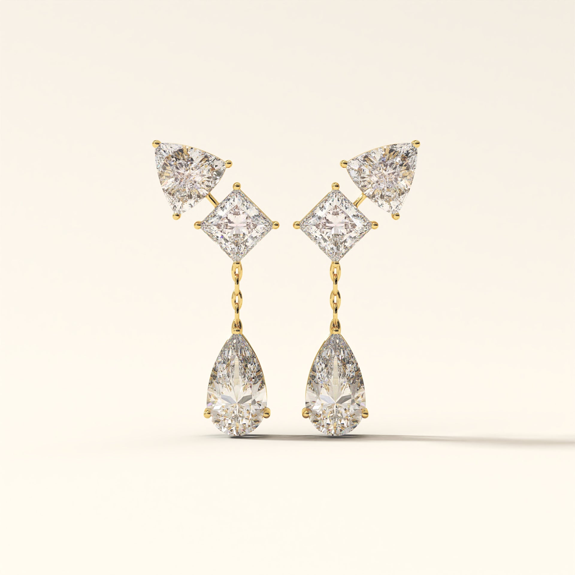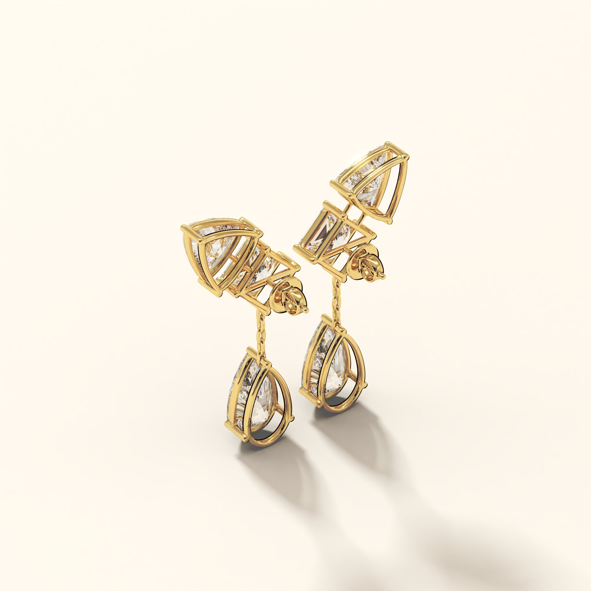 Crafted in 18K gold, Auric Cascade is engineered as a multi-cut drop earring with articulated linkages that allow controlled movement without compromising structure.Trillion and princess-cut diamonds form the upper framework, locked in sharp alignment, while the pear-shaped terminals anchor the design with weight and brilliance.