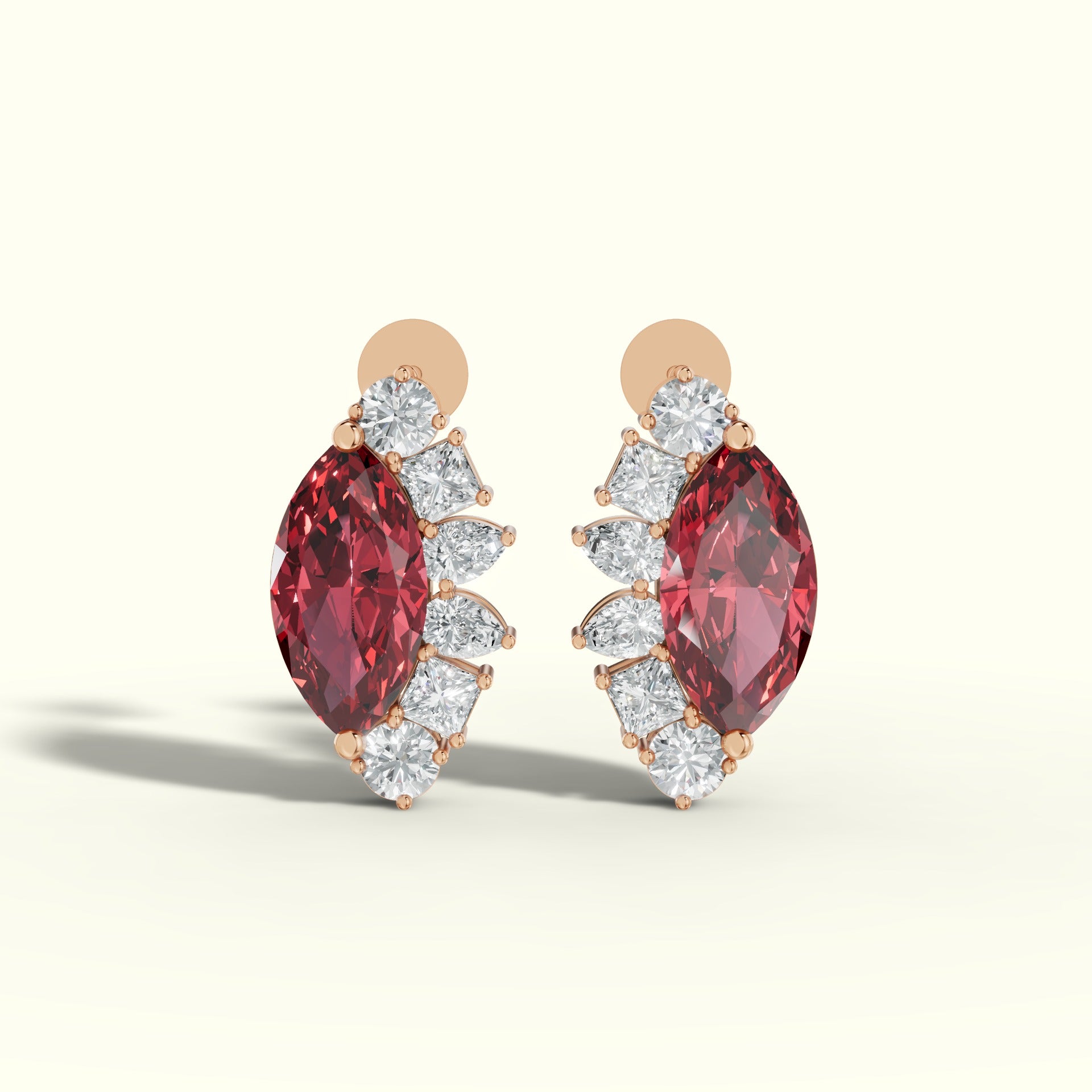 Crafted in 18K gold, Crimson Helix is built around a central marquise diamond, elevated just enough to allow light to enter from all sides. Surrounding it is a calibrated sequence of princess-cut, pear-cut, and round white diamonds, each set at a slightly different angle to create depth without chaos.