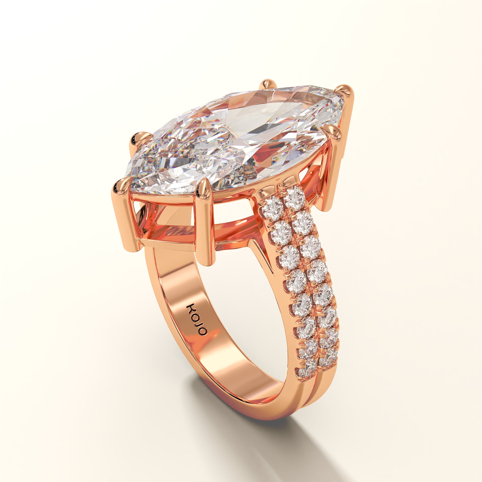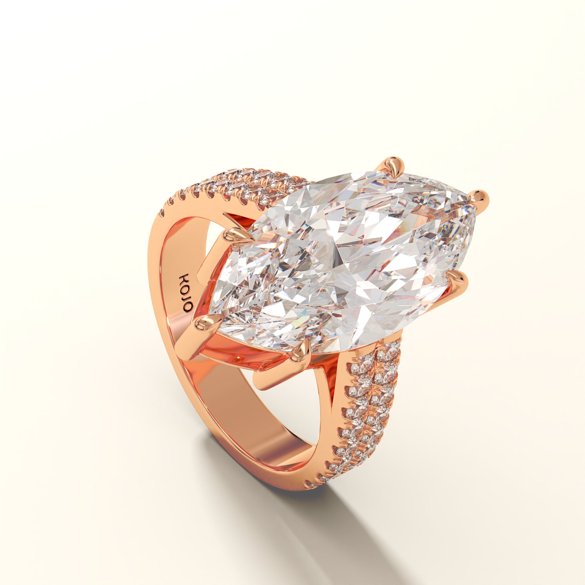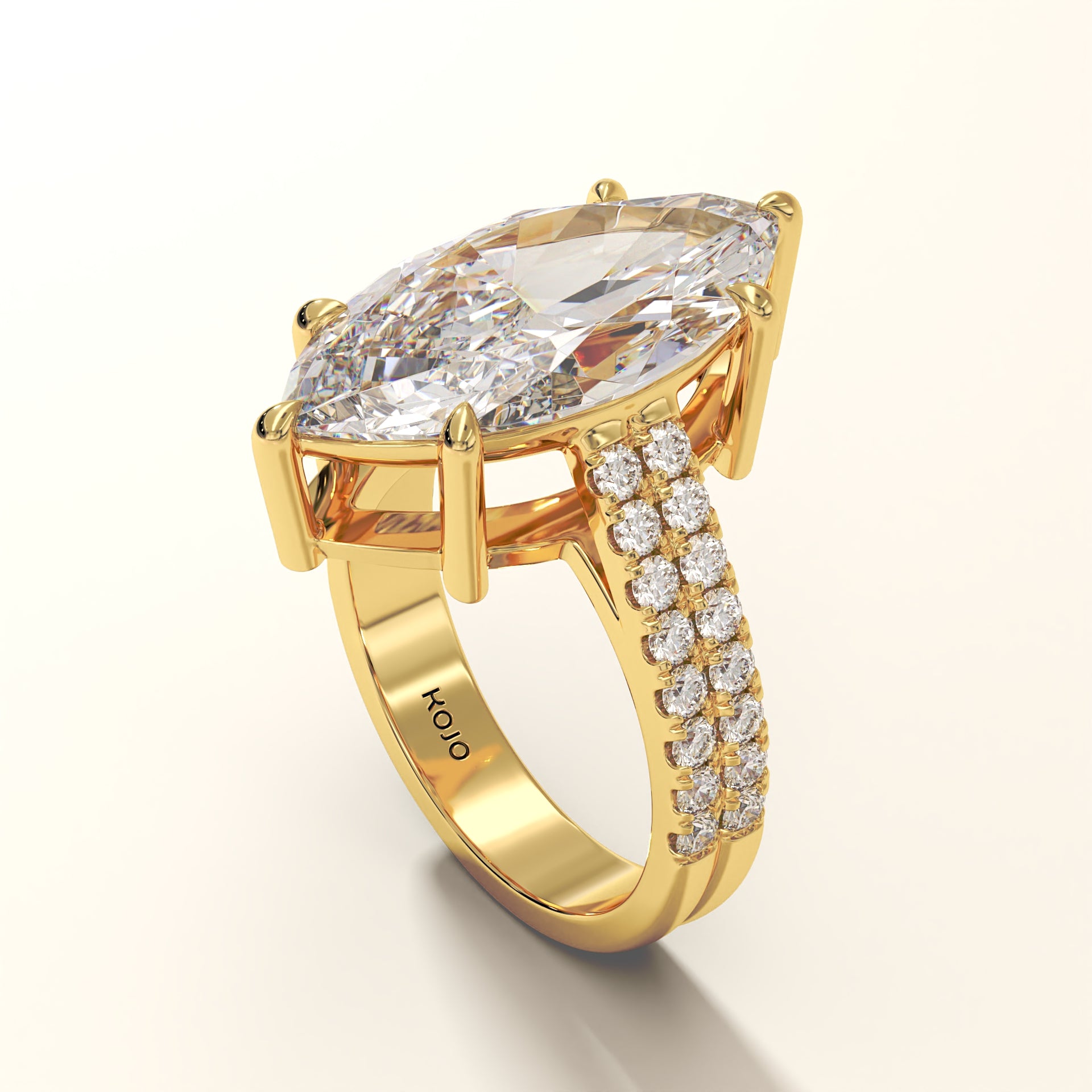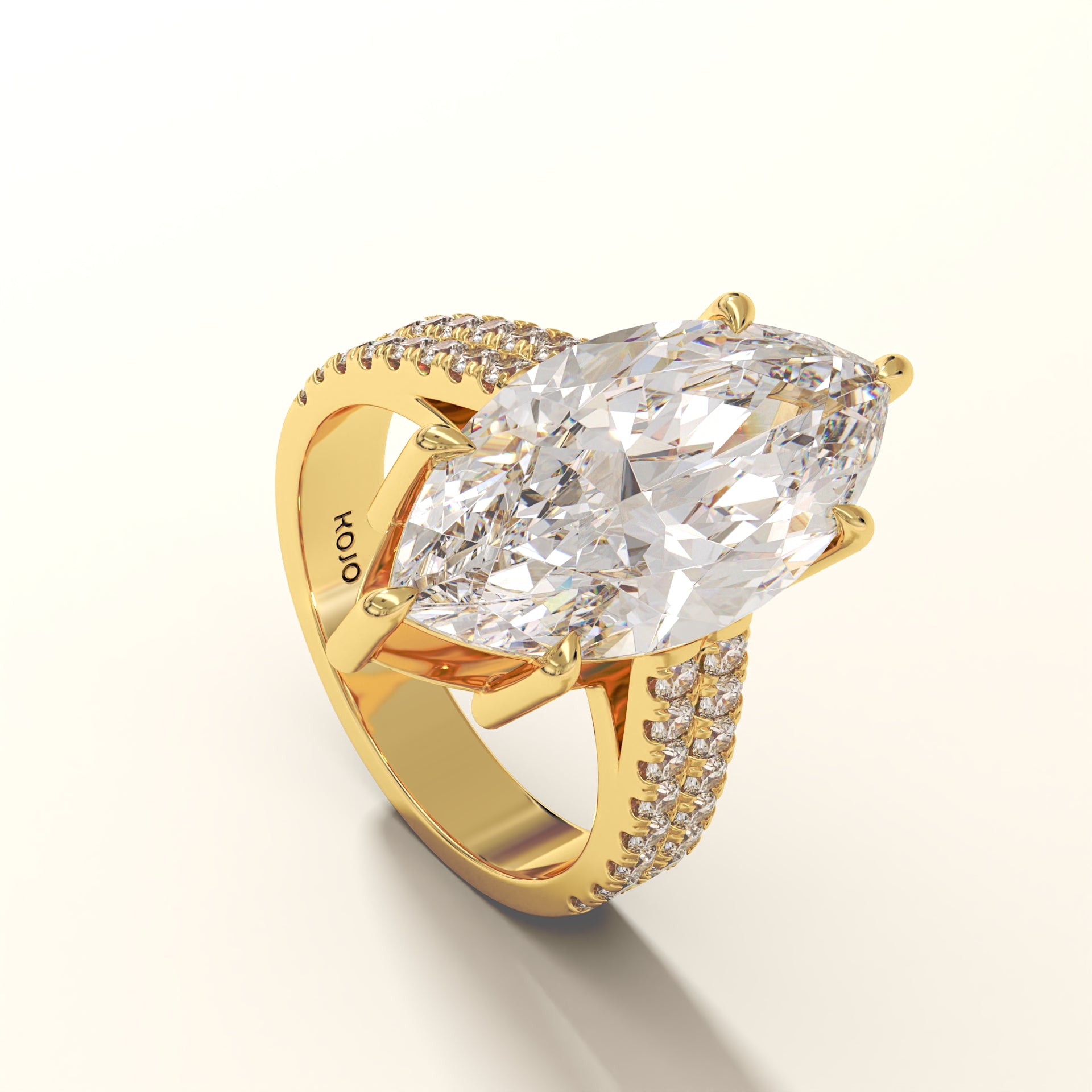 Forged in 18K gold, Eclipsera is a masterwork of proportion and polish. At its center rests a marquise-cut diamond (7.94 ct), elevated by six precision claws to command full exposure. Flanking the central stone, 32 micro-set round brilliants (0.67 ct) trace the shank in a double pavé arrangement, engineered for seamless symmetry and balance. The setting’s structural elevation ensures that even at its boldest scale, the ring remains poised, allowing the diamond to dominate from every angle.