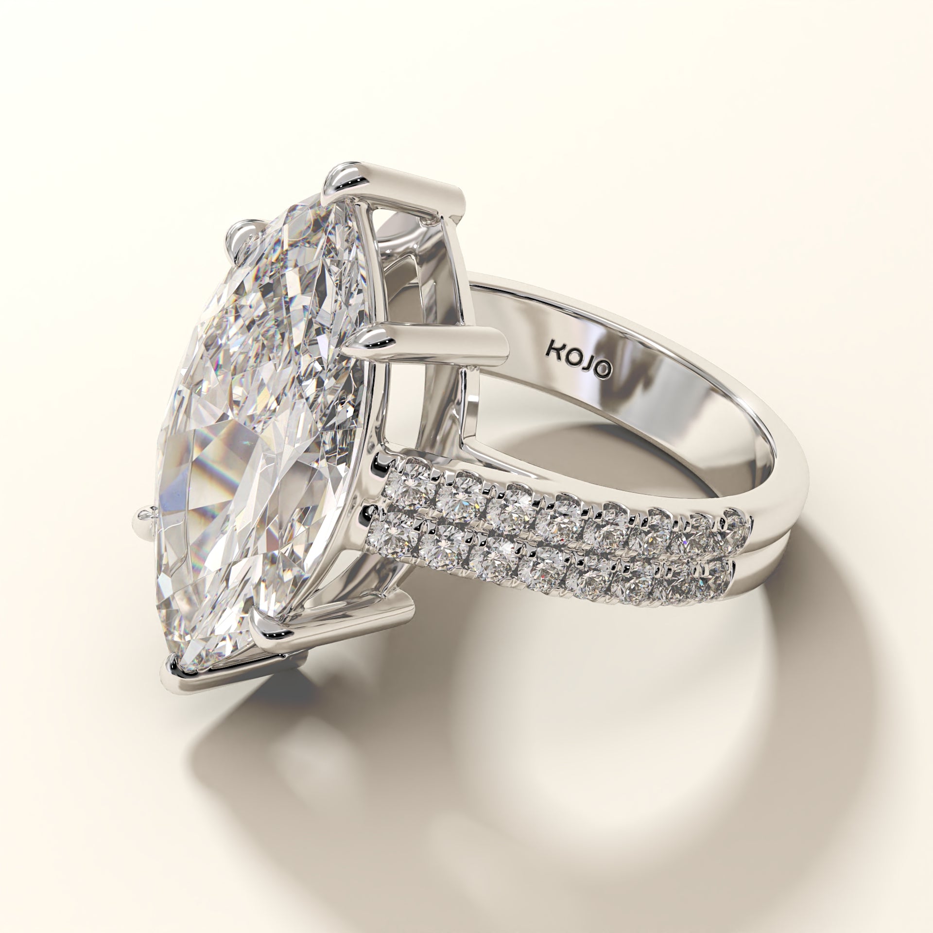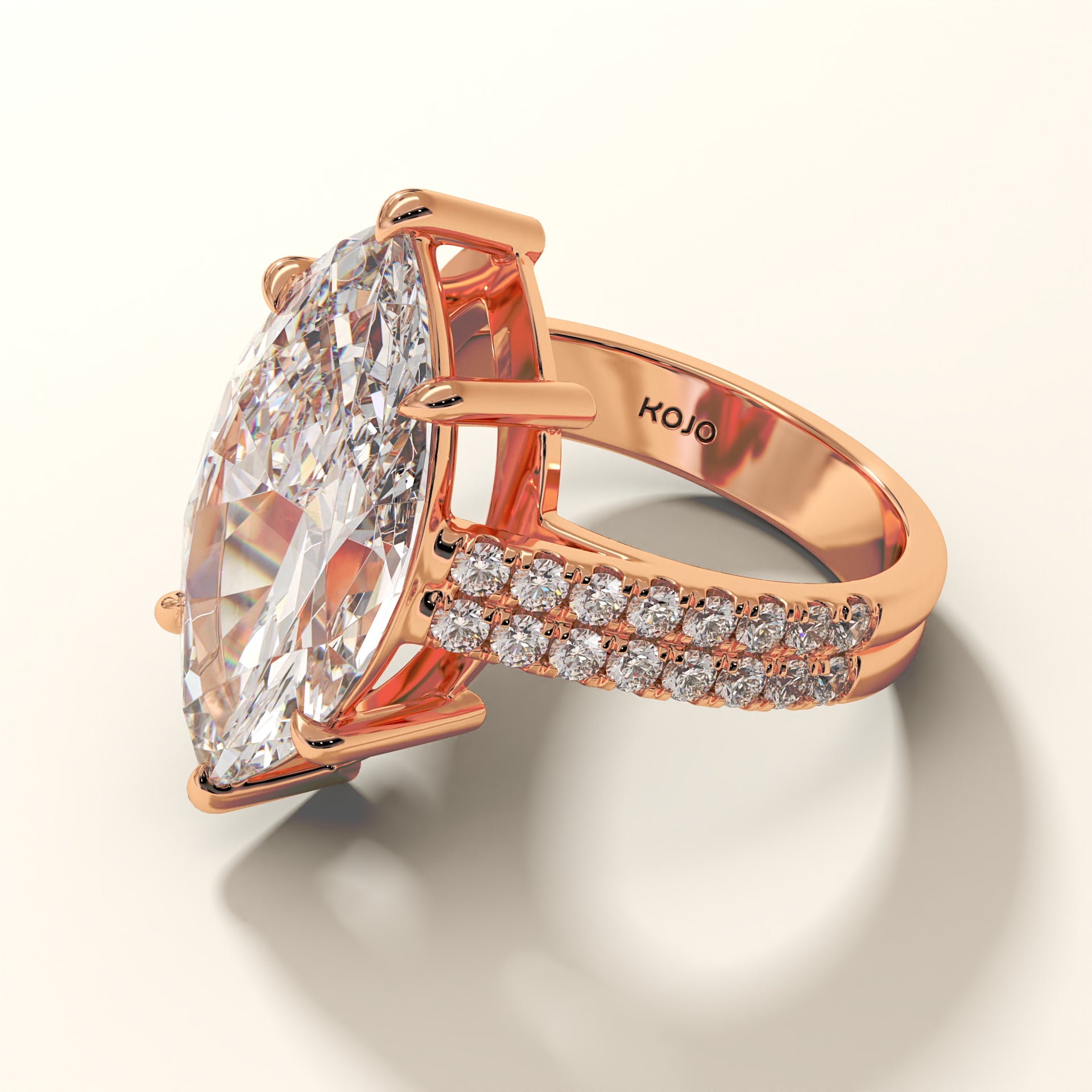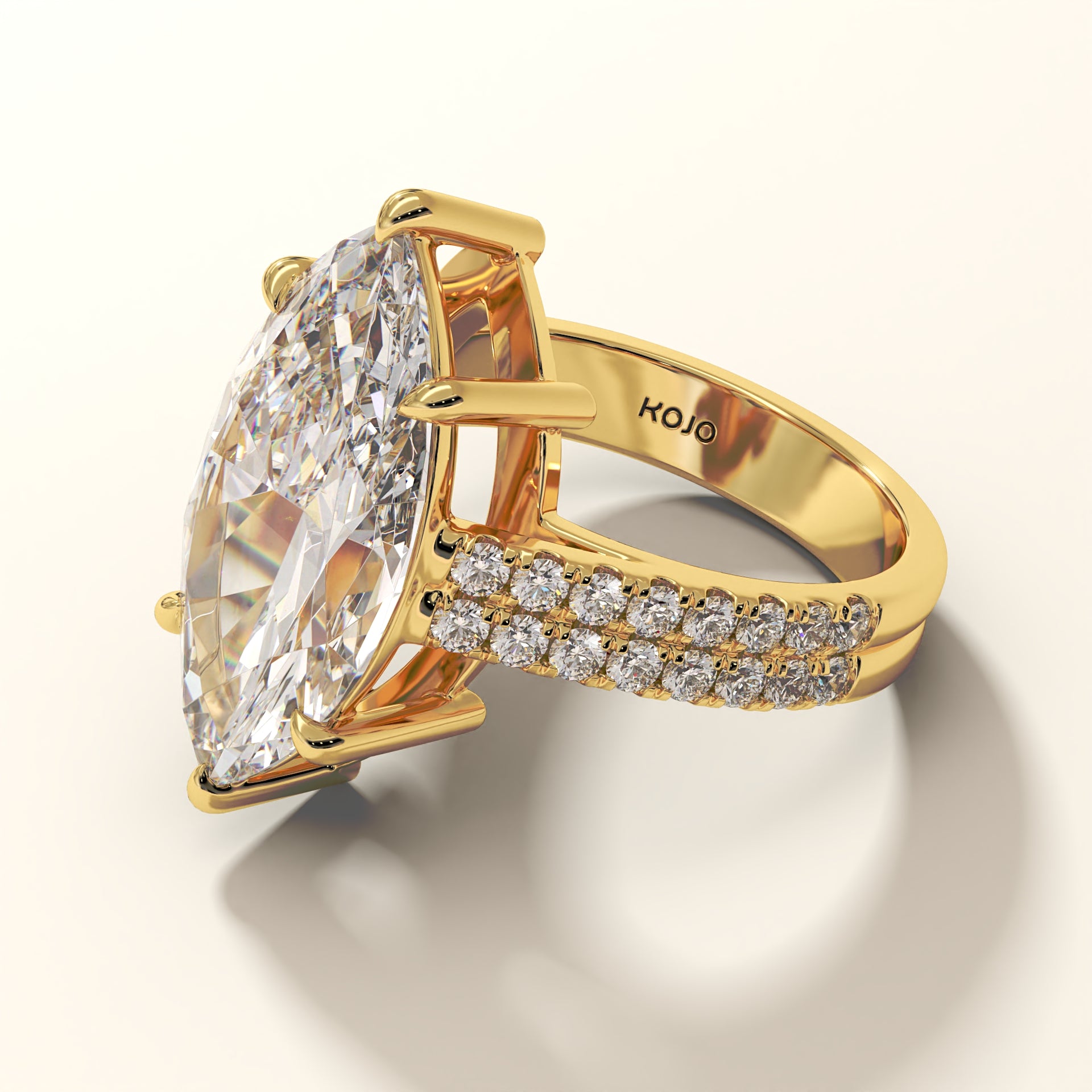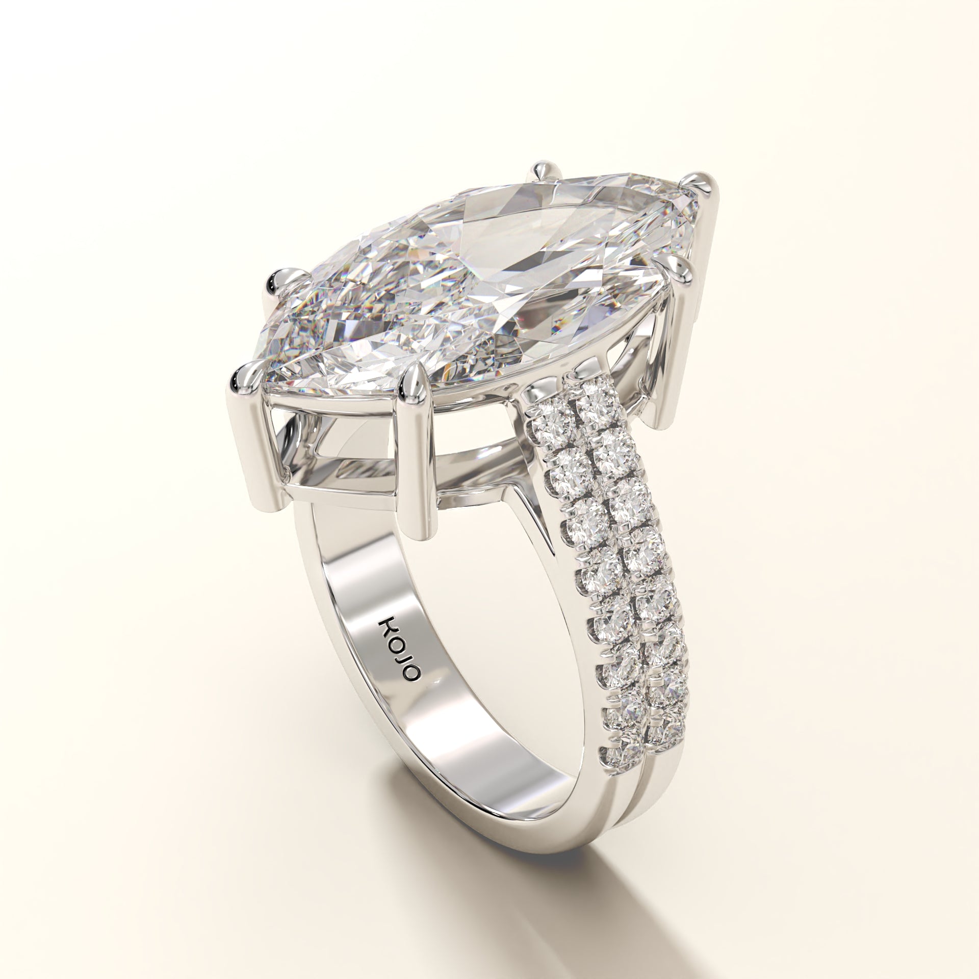 Forged in 18K gold, Eclipsera is a masterwork of proportion and polish. At its center rests a marquise-cut diamond (7.94 ct), elevated by six precision claws to command full exposure. Flanking the central stone, 32 micro-set round brilliants (0.67 ct) trace the shank in a double pavé arrangement, engineered for seamless symmetry and balance. The setting’s structural elevation ensures that even at its boldest scale, the ring remains poised, allowing the diamond to dominate from every angle.