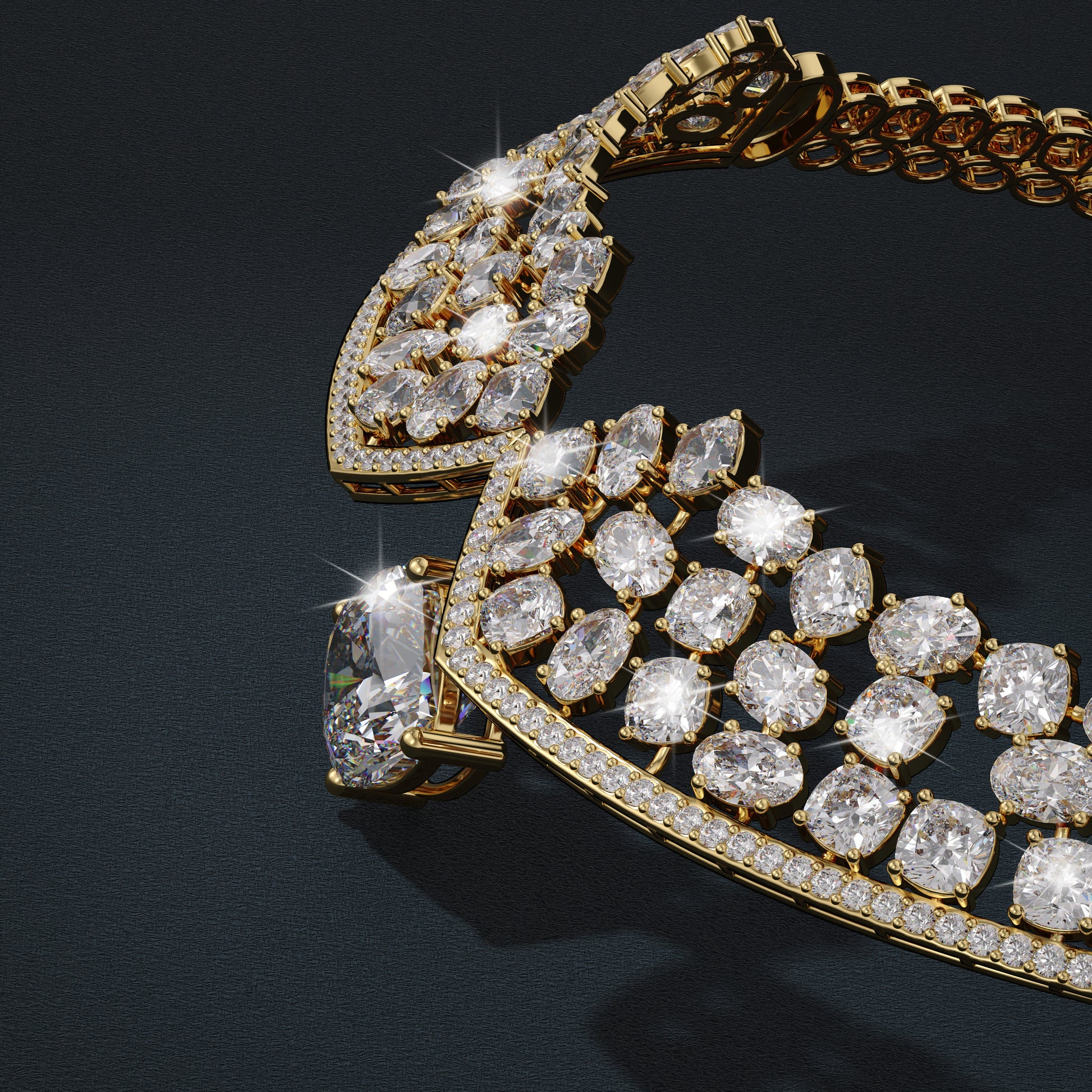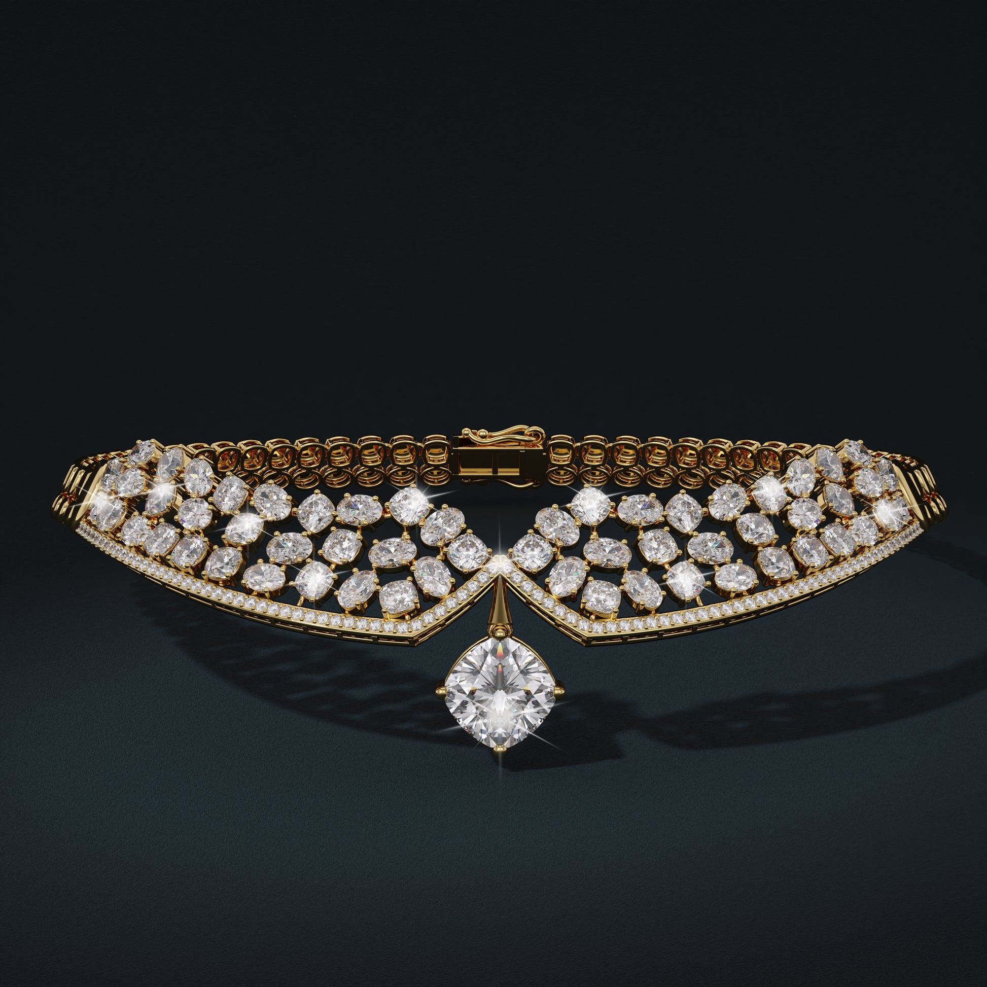 Regent of Light is composed with authority : a statement shaped not by excess, but by control. Diamonds align in disciplined symmetry, converging toward a suspended centre that anchors the entire form. Every element feels deliberate, measured, and resolute.